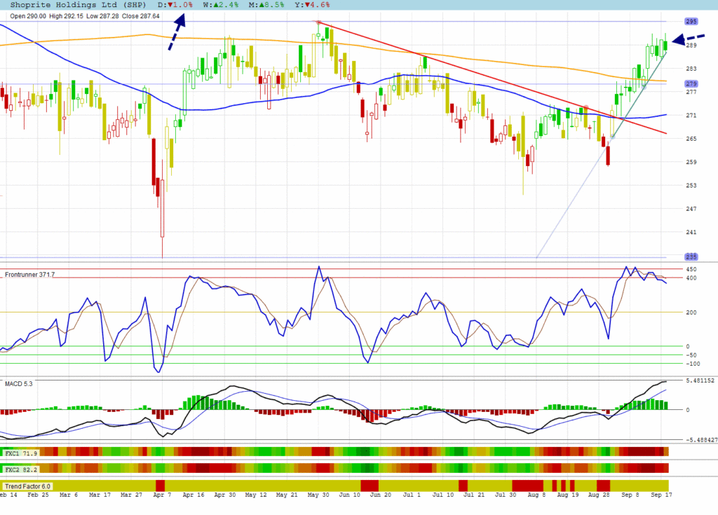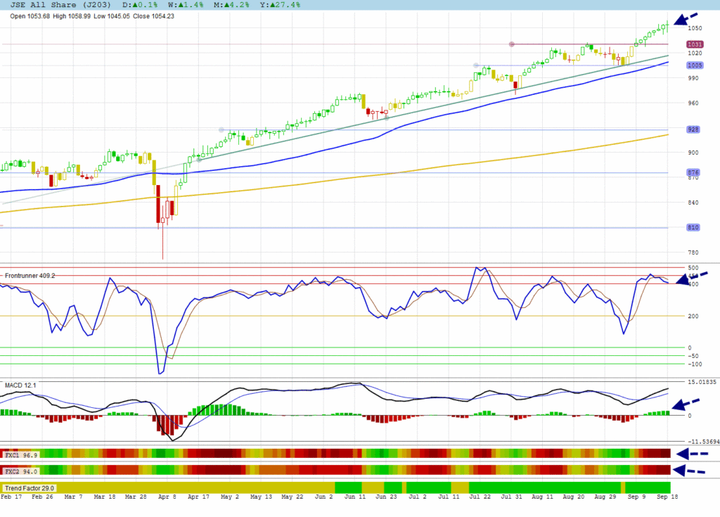 The JSE All Shares made an uncertain long-legged doji in extreme overbought territory. Notice that the MACD changed colour and Frontrunner is heading down. Confirmation is still needed to confirm signals.