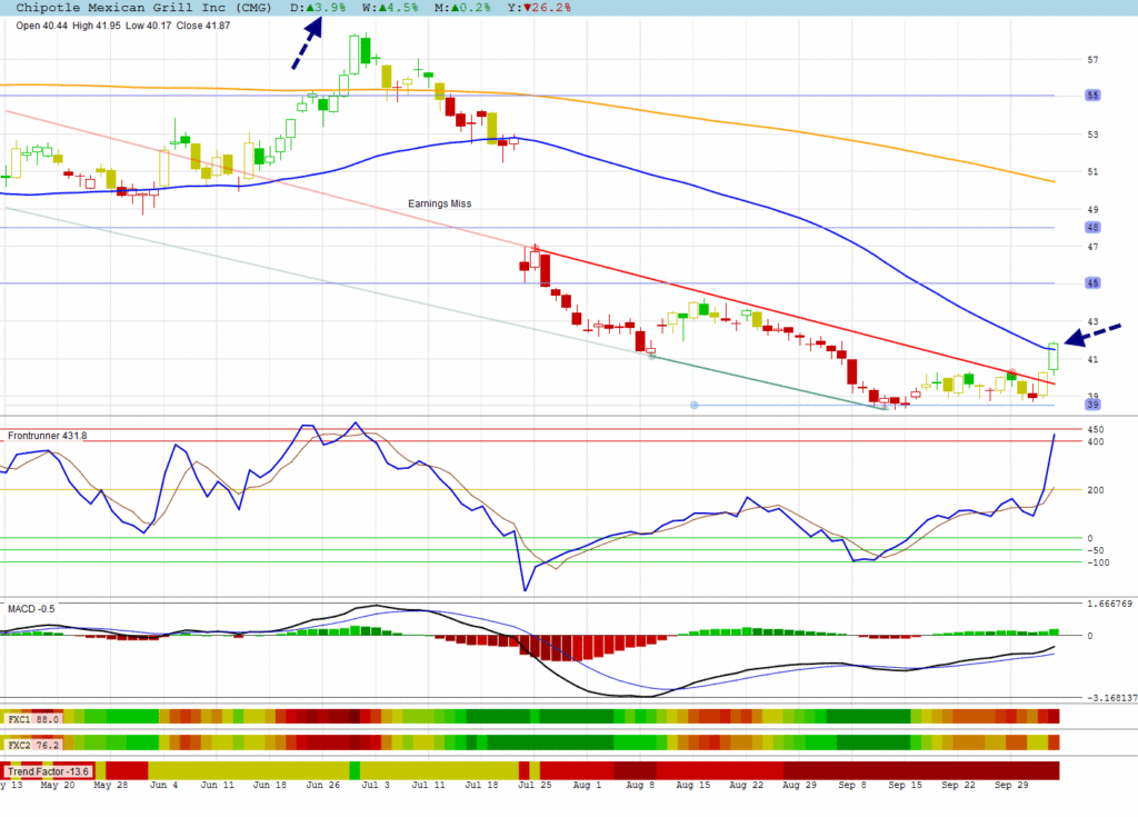 CMG broke its negative trend line and 50 DMA resistance with a strong bullish gain.
