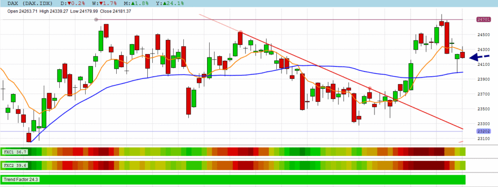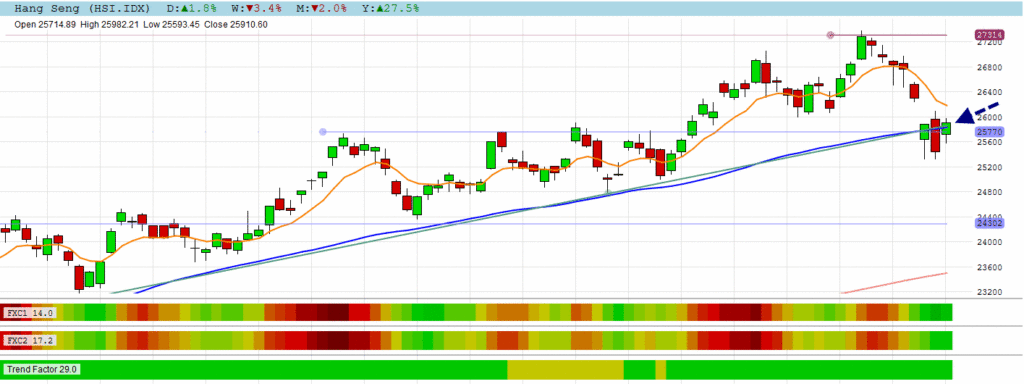The HANG SENG is trending on its 50 DMA as the trade war continues.