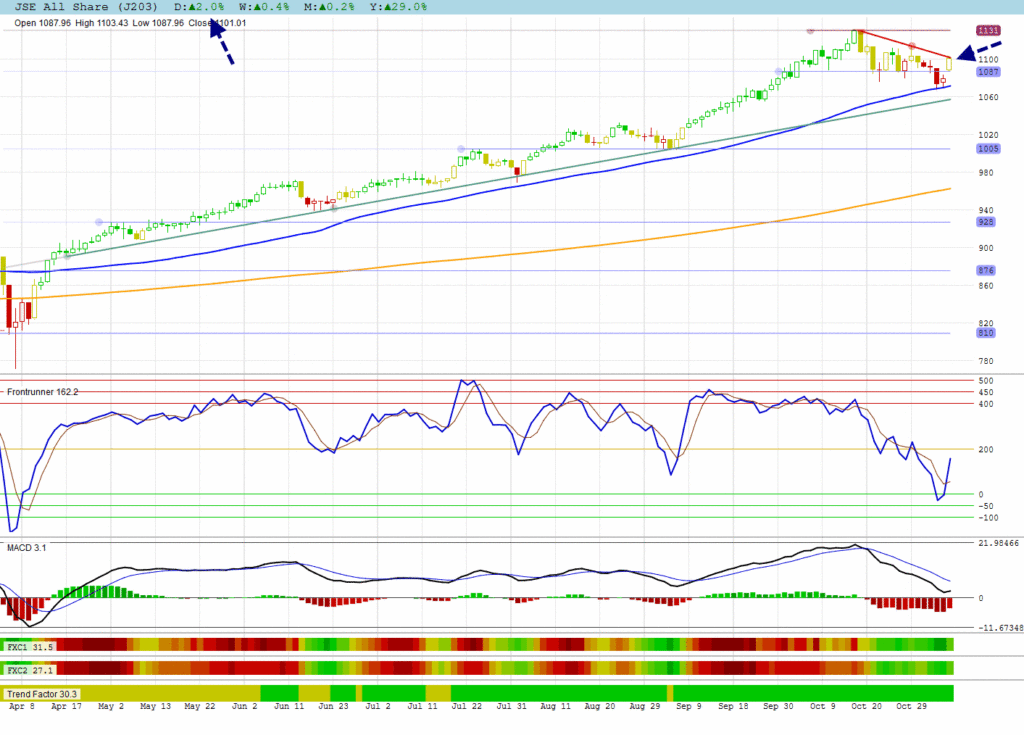 The JSE All Shares made a breakaway gap on its 50 DMA support.