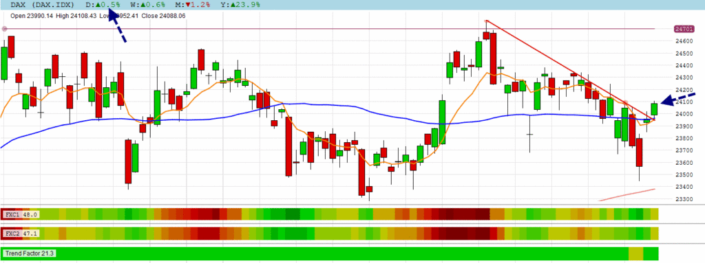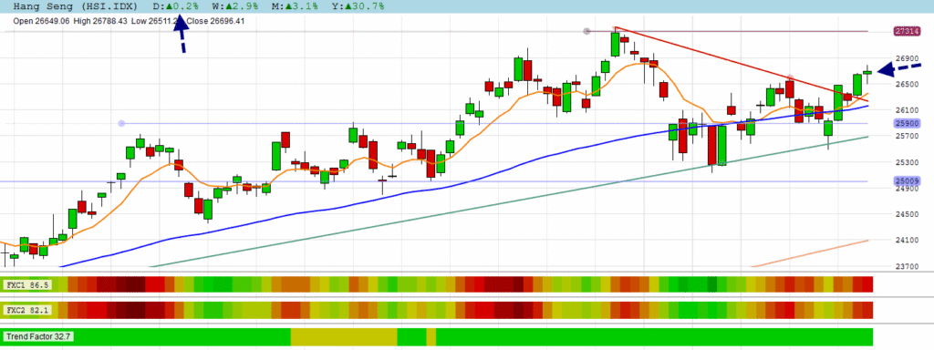 The HANG SENG stalled with a high wave candle but is continuing the positive trend this morning.