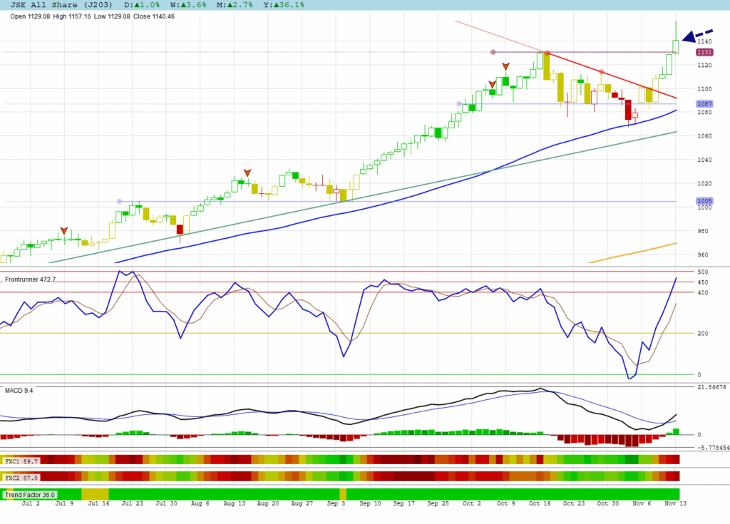 The JSE All Shares made an inverted hammer candle to close at a new high.