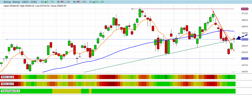 The HANG SENG closed with a high wave candle on its EMA8 line resistance.