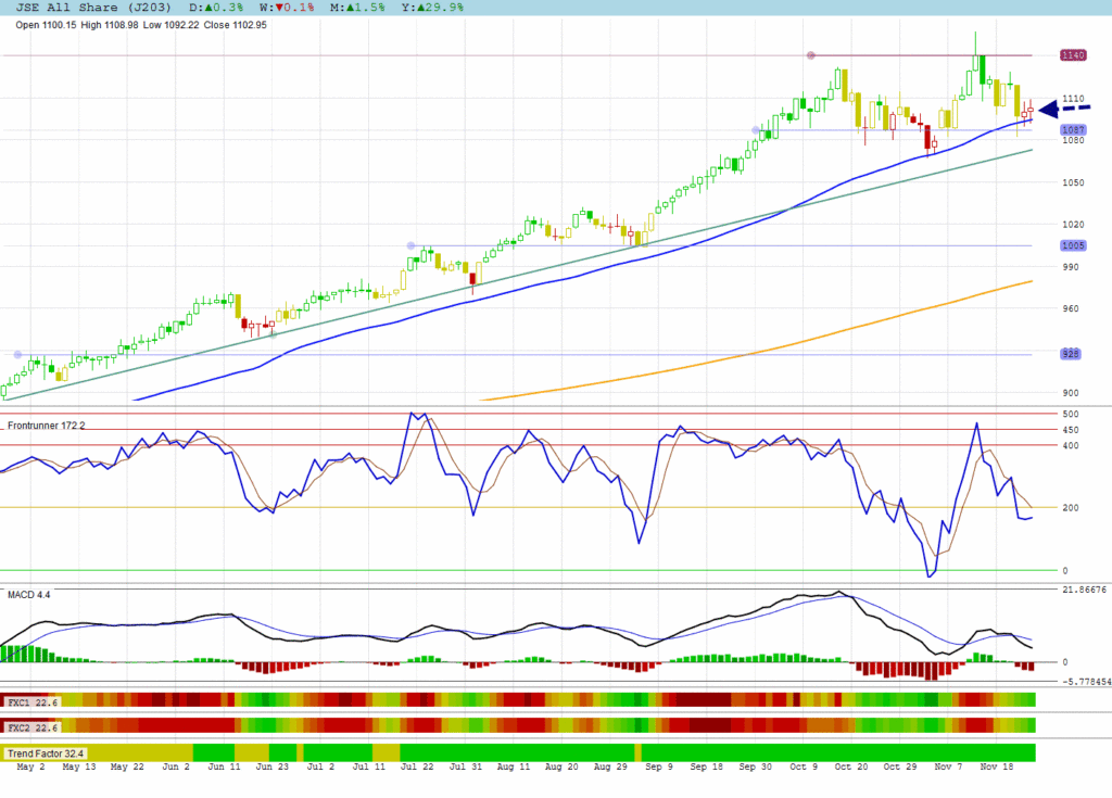 The JSE All Shares remained uncertain with another high wave candle on its 50 DMA support.
