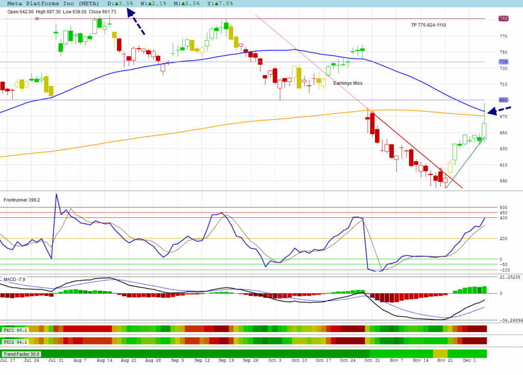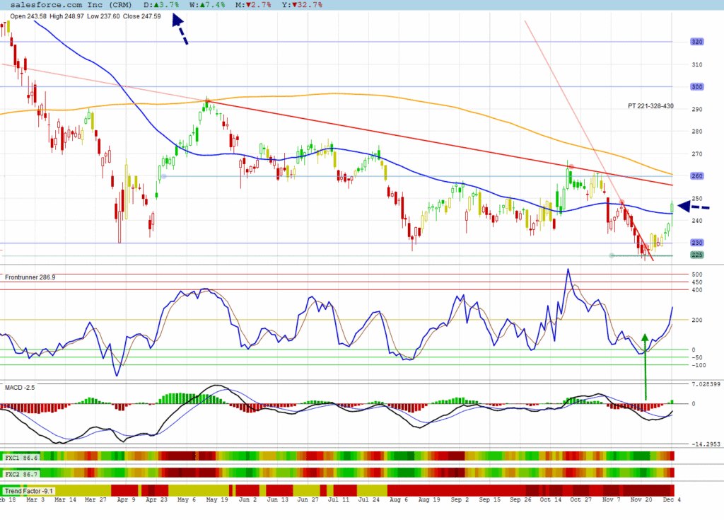 CRM sailed through its 50 DMA resistance with a 3.7% gain. Notice where Frontrunner broke up and the MACD changed colour.