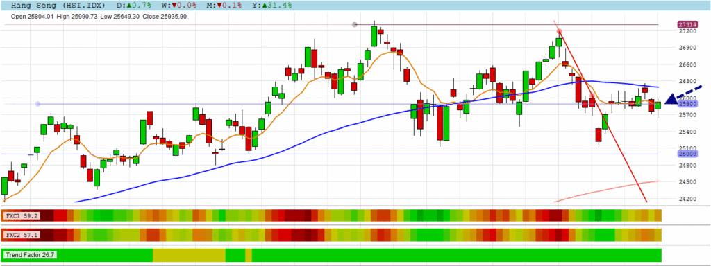 The HANG SENG is still moving sideways on its EMA8 line. Notice that the weekly gain is zero.