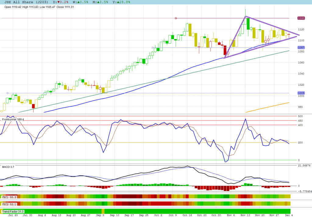 The JSE All Shares is waiting for global moves to break out of its triangle. It could be up or down?