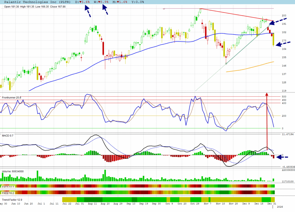 PLTR had the worst opening for 2026. Notice where its downward breakaway gap occurred. Never ignore gaps!