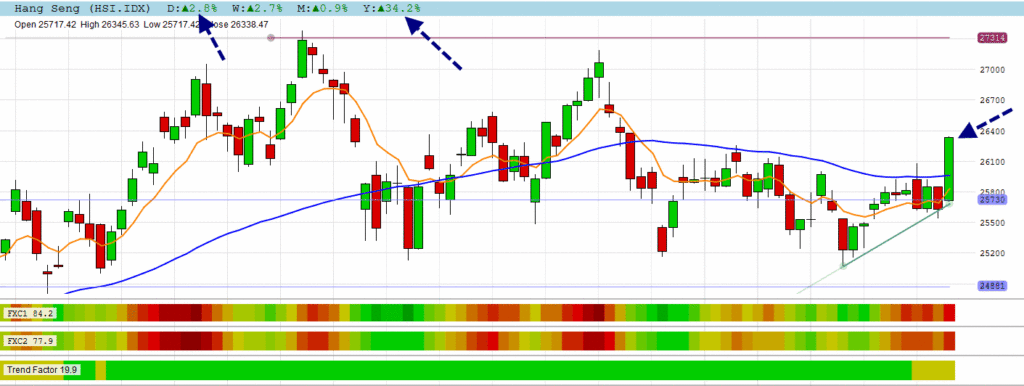 The HANG SENG broke its 50 DMA resistance after closing 6 weeks below it, helped by the listing of Birem. Its gain for the past year was 34.2%, much better than the other global indexes, but coming from a very low basis.