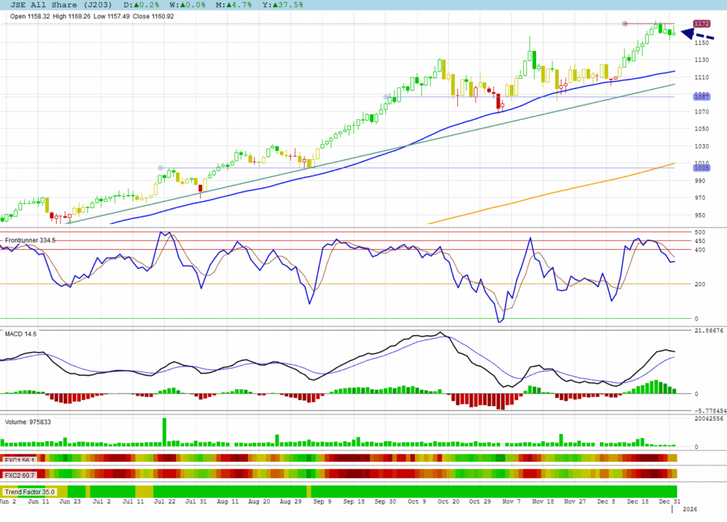Although NPH closed close to high expectations against top resistance, AI is giving it as one of the preferred shares for 2026. Maybe best to wait for a correction as it is showing divergence at current levels. Also shown on the graph is where abnormal volumes changed hands … sign of changing direction. Use all the technical signs to your advantage as highlighted in Algomodel Signals Pro.