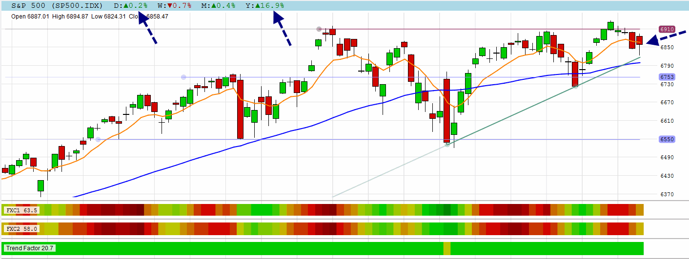 The S&P 500 edged higher below strong resistance. Notice that the past years gain was 16.9% with a Rand that strengthened 12% leaving you with a 4.9% gain.