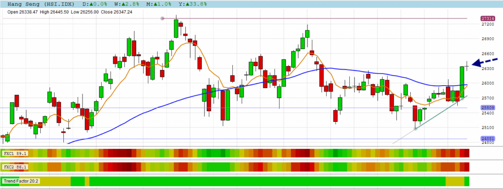 The HANG SENG took a breather with a doji, but continued the positive rally this morning.