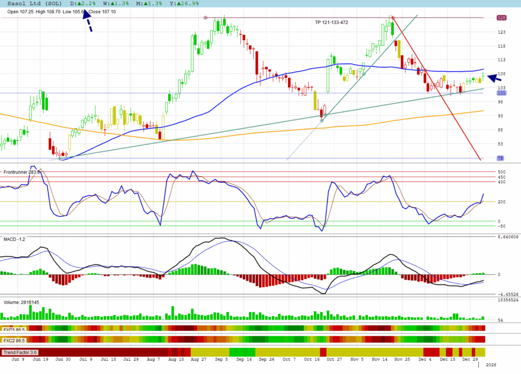 Sasol did not join the US rally yet and is still hesitating with a long-legged doji below its 50 DMA. Notice that its MACD did turn green with Frontrunner heading up.