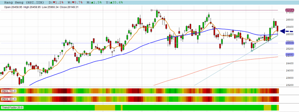The HANG SENG corrected back to its EMA8 line and also touched its 50 DMA support.