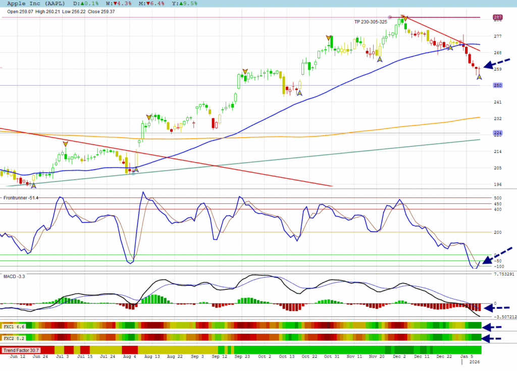 The abc correction of AAPL stalled in oversold territory with a hammer and long-legged doji (turning candles) next to each other.