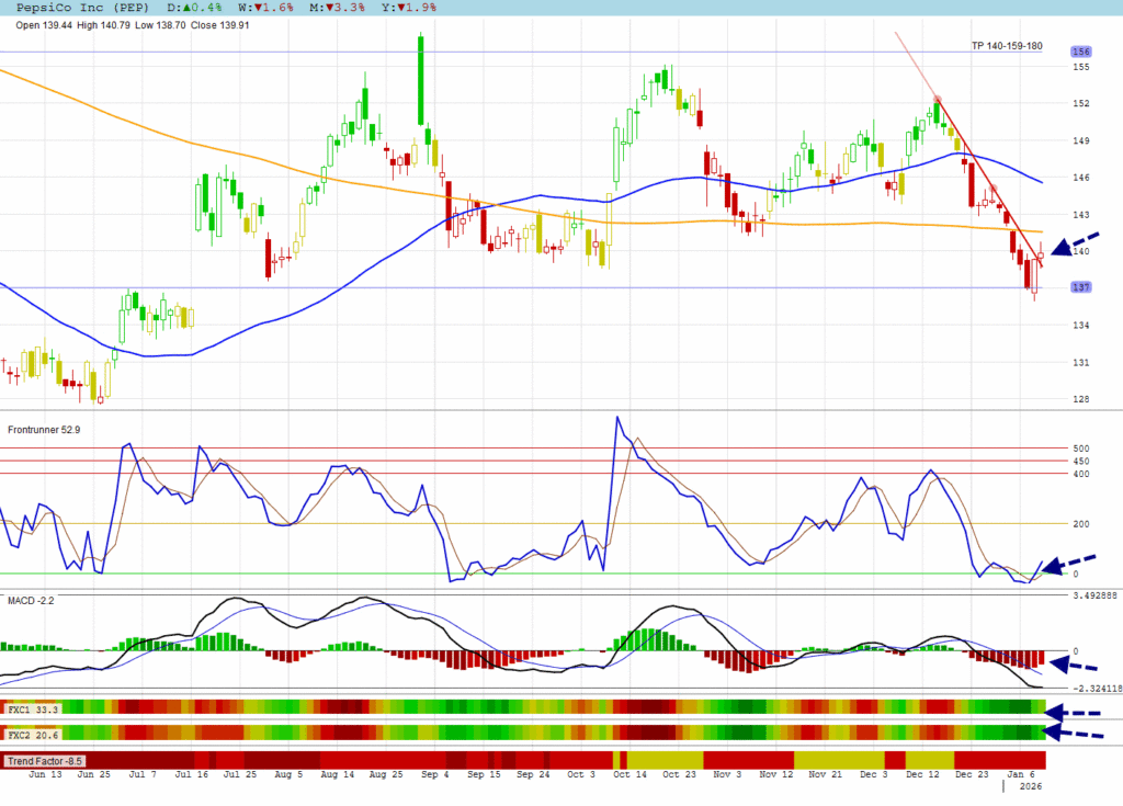 PEP is breaking its negative trend in oversold territory. Many banks have raised their target price to $165 for this share giving it a 17% upside potential.