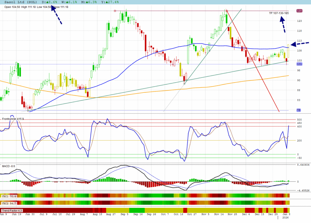 SOL finally gathered enough steam to break its 50 DMA. Average target price R130. Keep in mind that this is yearly target prices by analysts.