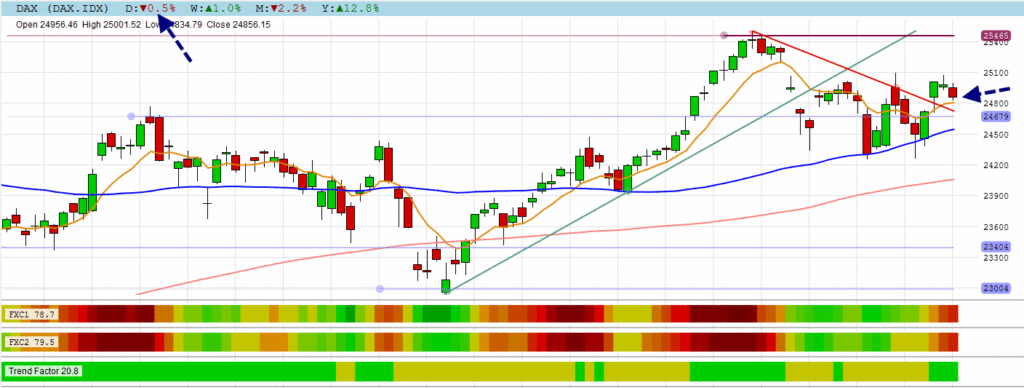 The DAX eased back – still above its EMA8 line.