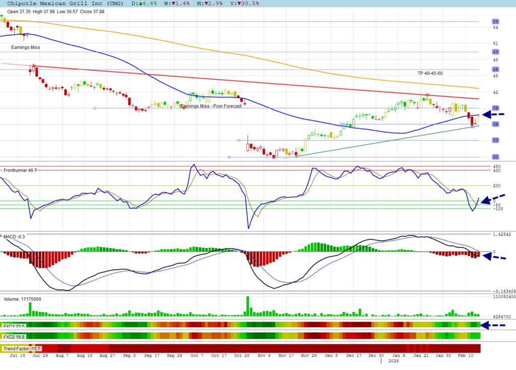 CMG bounced on its $36 support to close on its 50 DMA resistance.