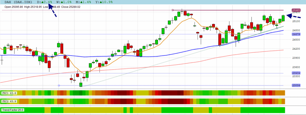 The DAX is still gaining towards top resistance.
