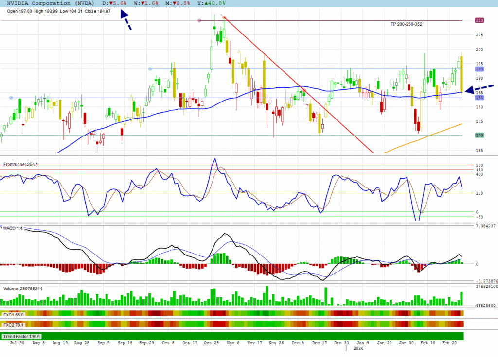 NVDA corrected 5.6% to close on its 50 DMA support as investors are nervous about future margin sustainability despite 73% year-over-year revenue growth.