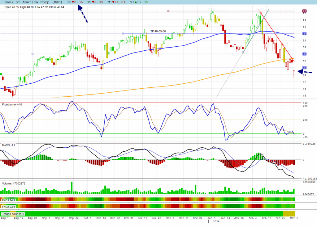 BAC made a downwards gap (exhaustion gap?) away from its 200 DMA resistance with a long-legged hammer candle.