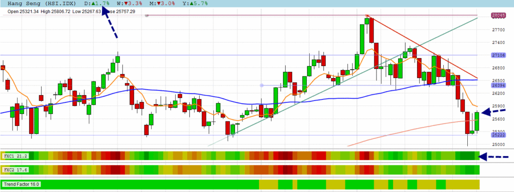 The HANG SENG made a bullish candle after the inverted hammer candle in oversold territory. It managed to close above its 200 DMA, but still below the shorter-term averages. It tumbles with global market this morning.