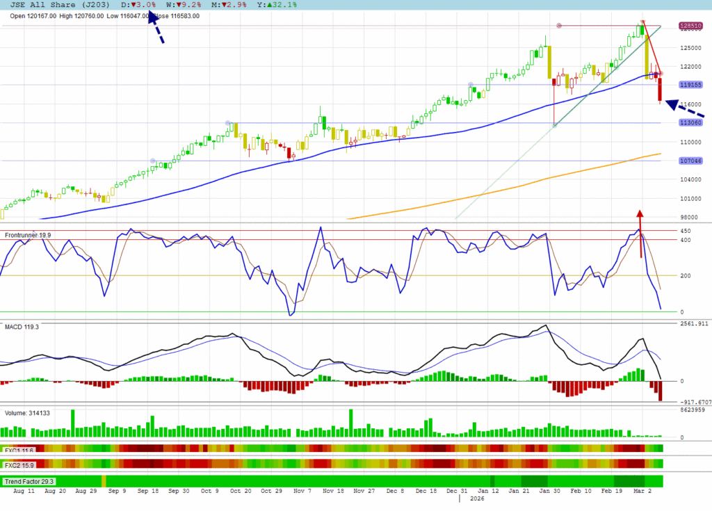 The JSE All Shares followed global markets lower breaking its 50 DMA support.