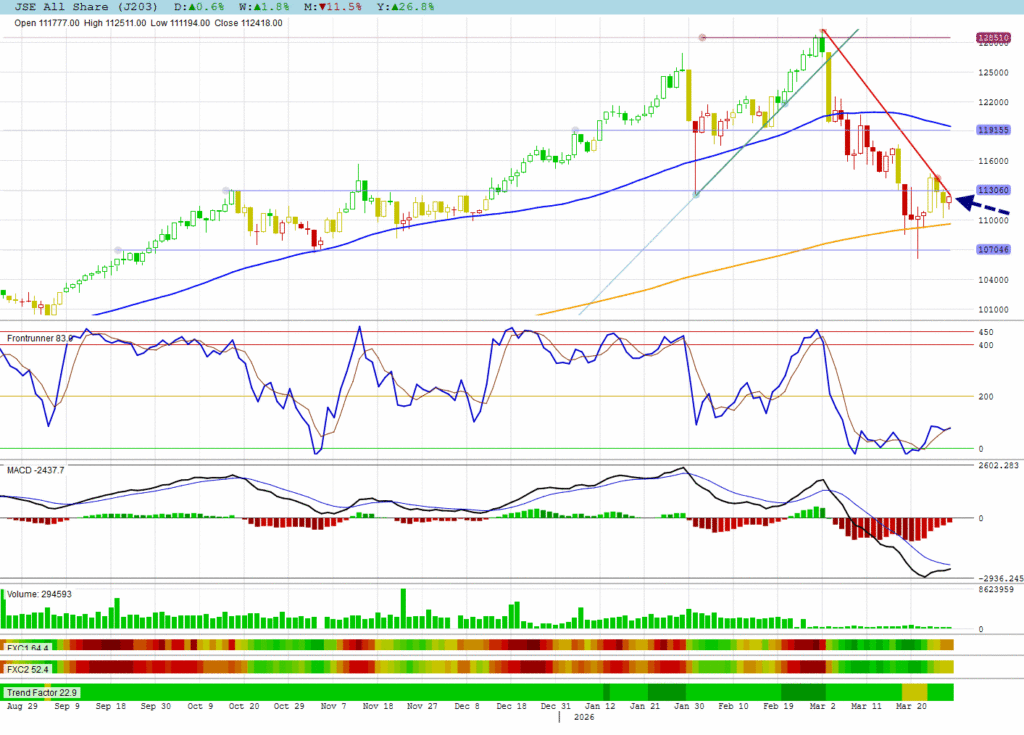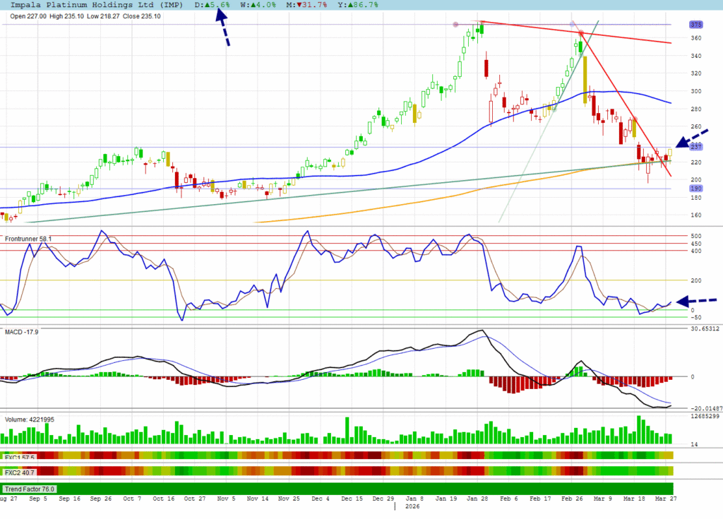 The JSE All Shares also made a piercing candle in the form of a hammer candle. Notice that Frontrunner has broken up and that the MACD is on the verge of turning green.