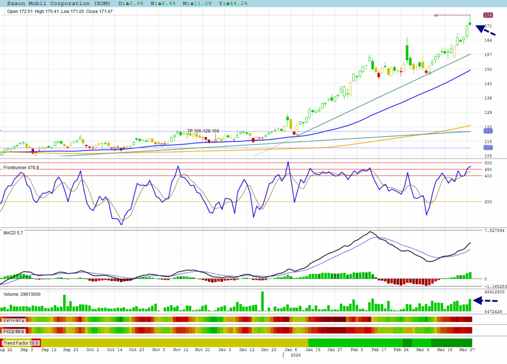 XOM made an inverted hammer to signal a possible high. Notice the volume increase as profit taking stepped in.