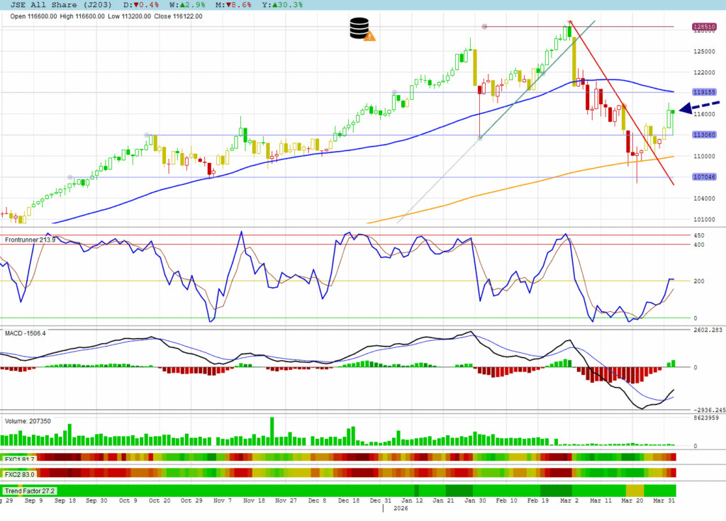 The JSE All Shares made a very long-legged hammer candle to show its uncertainty.