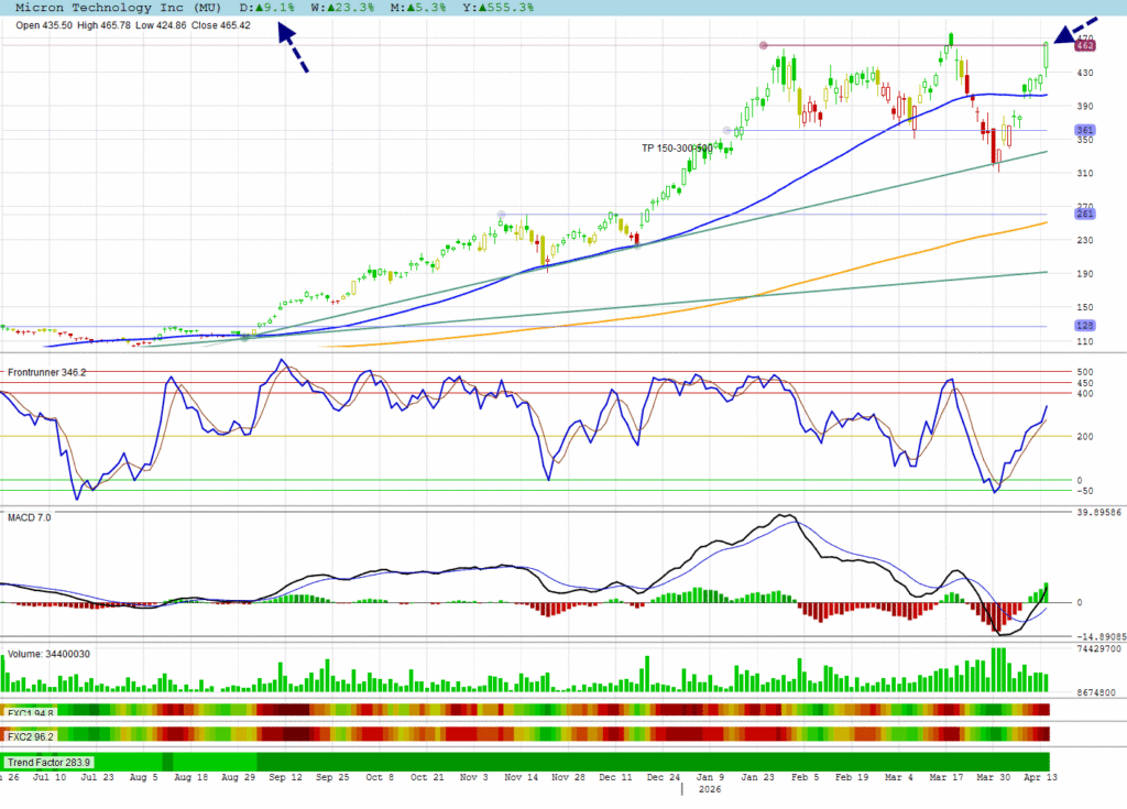 MU was the best performer of the day with its 9.1% gain, testing top resistance.