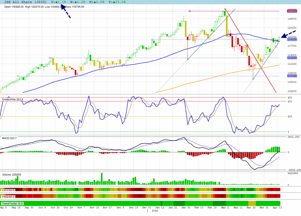 The JSE All Shares followed global markets higher confirming a ‘Three Inside Up’ formation.