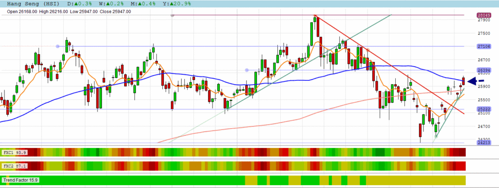 The HANG SENG made a first attempt to break 50 DMA only to close below it. It is currently trading above it.