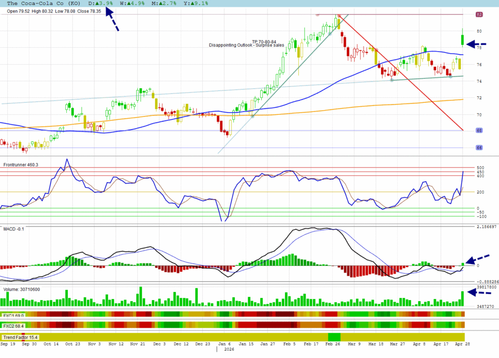 KO made a breakaway gap to close above its 50 DMA resistance.